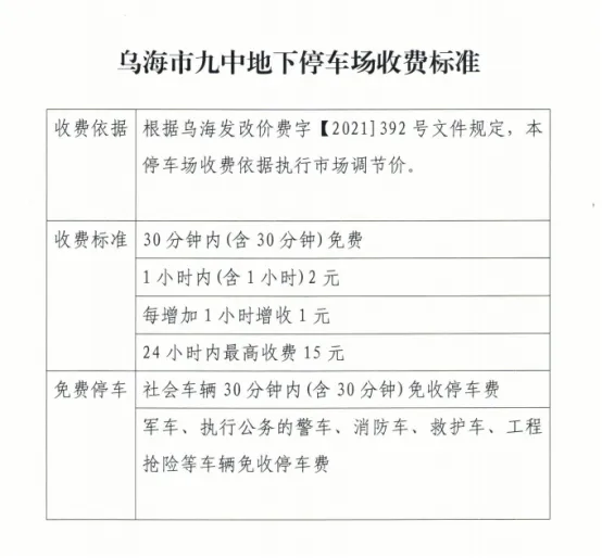為緩解地面停車(chē)壓力,引導(dǎo)車(chē)輛有序停放,烏海市濱河九中地下停車(chē)場(chǎng)與麗晶國(guó)際酒店地下停車(chē)場(chǎng)已完成智能化升級(jí)改造。2024年7月25日經(jīng)海勃灣區(qū)城市管理綜合執(zhí)法局批準(zhǔn),兩個(gè)停車(chē)場(chǎng)于近期正式開(kāi)展停車(chē)收費(fèi)管理,收費(fèi)標(biāo)準(zhǔn)見(jiàn)下表: